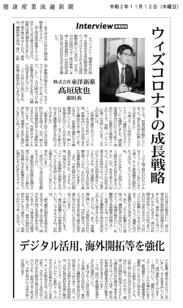 健康産業流通新聞で副社長取締役高垣のインタビュー「ウィズコロナ下の成長戦略」が掲載されました