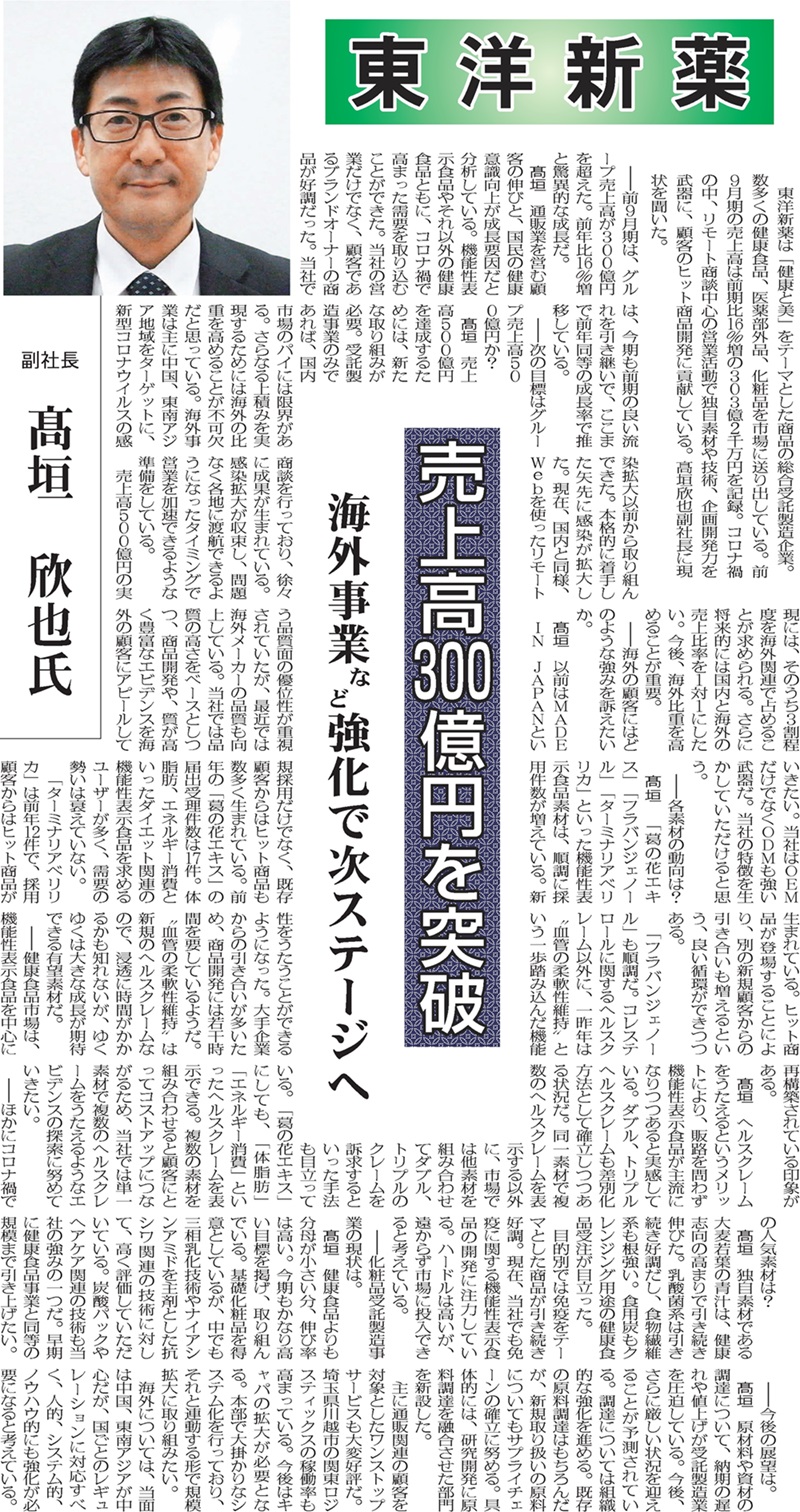 食品新聞の「健康食品特集」で副社長取締役高垣のインタビューが掲載されました