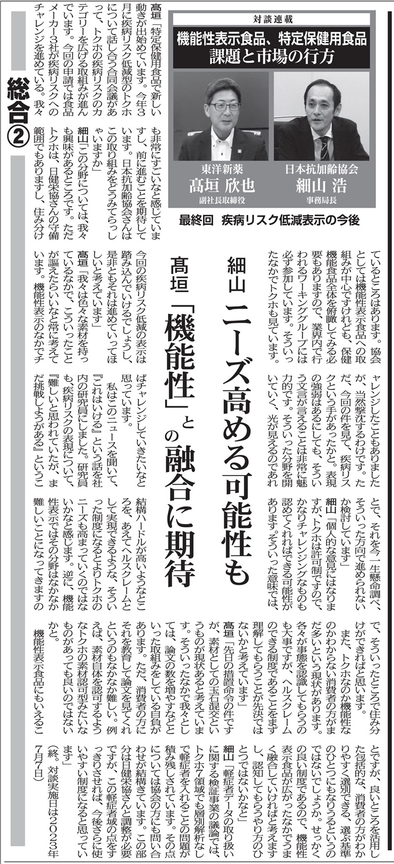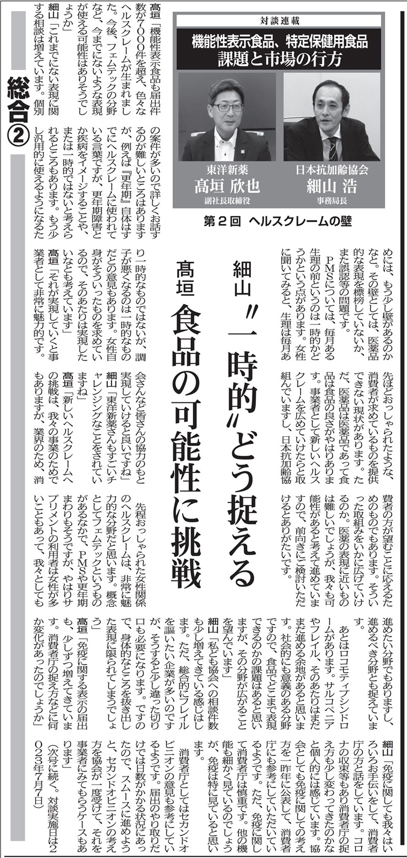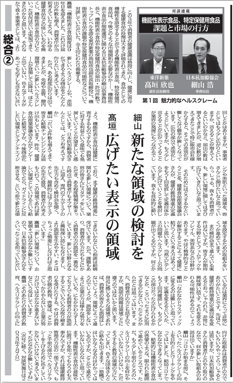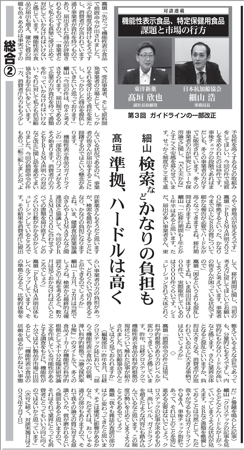 健康産業流通新聞で、日本抗加齢協会 事務局長 細山様と弊社 副社長取締役 高垣の対談が掲載されました