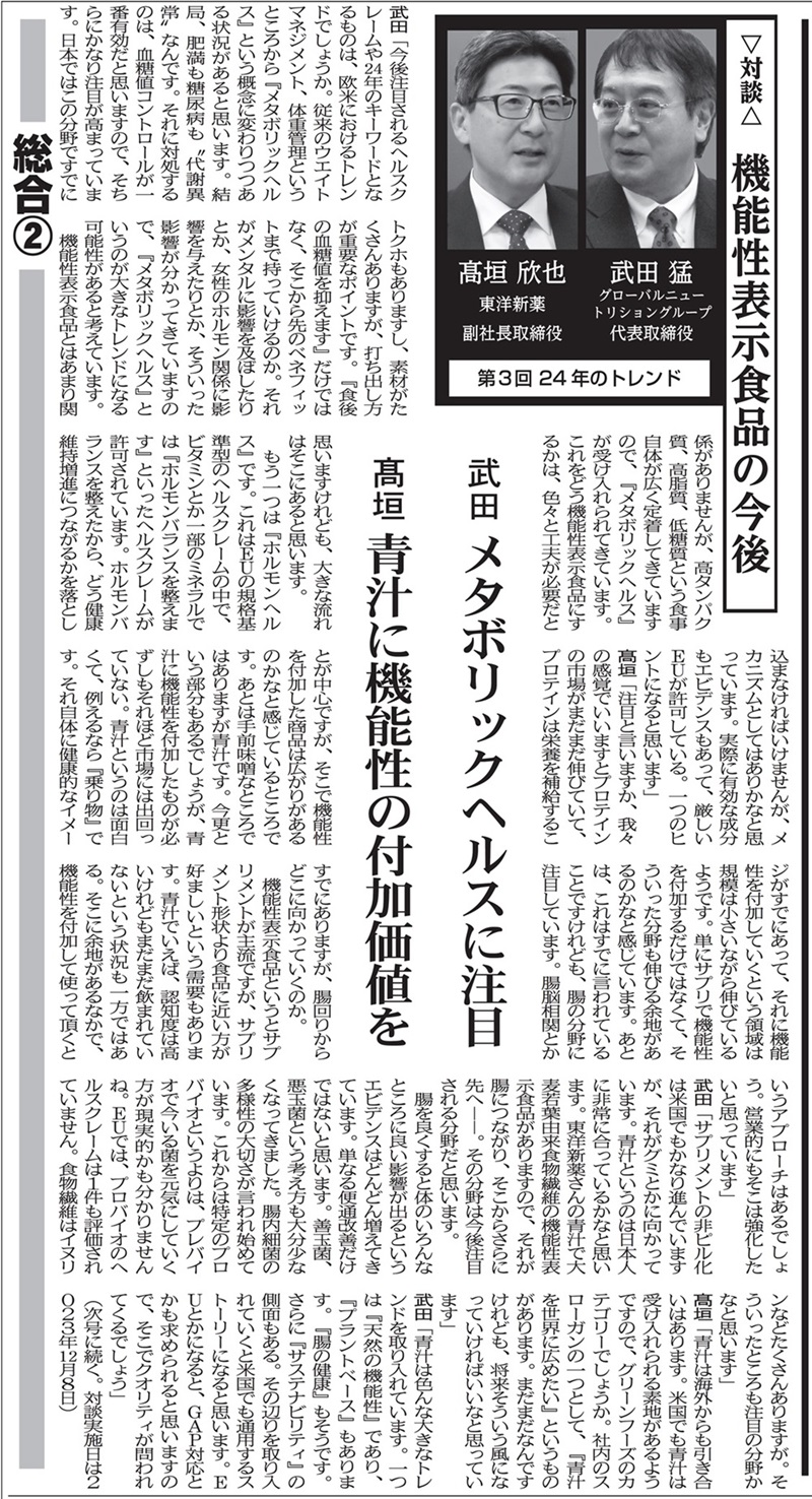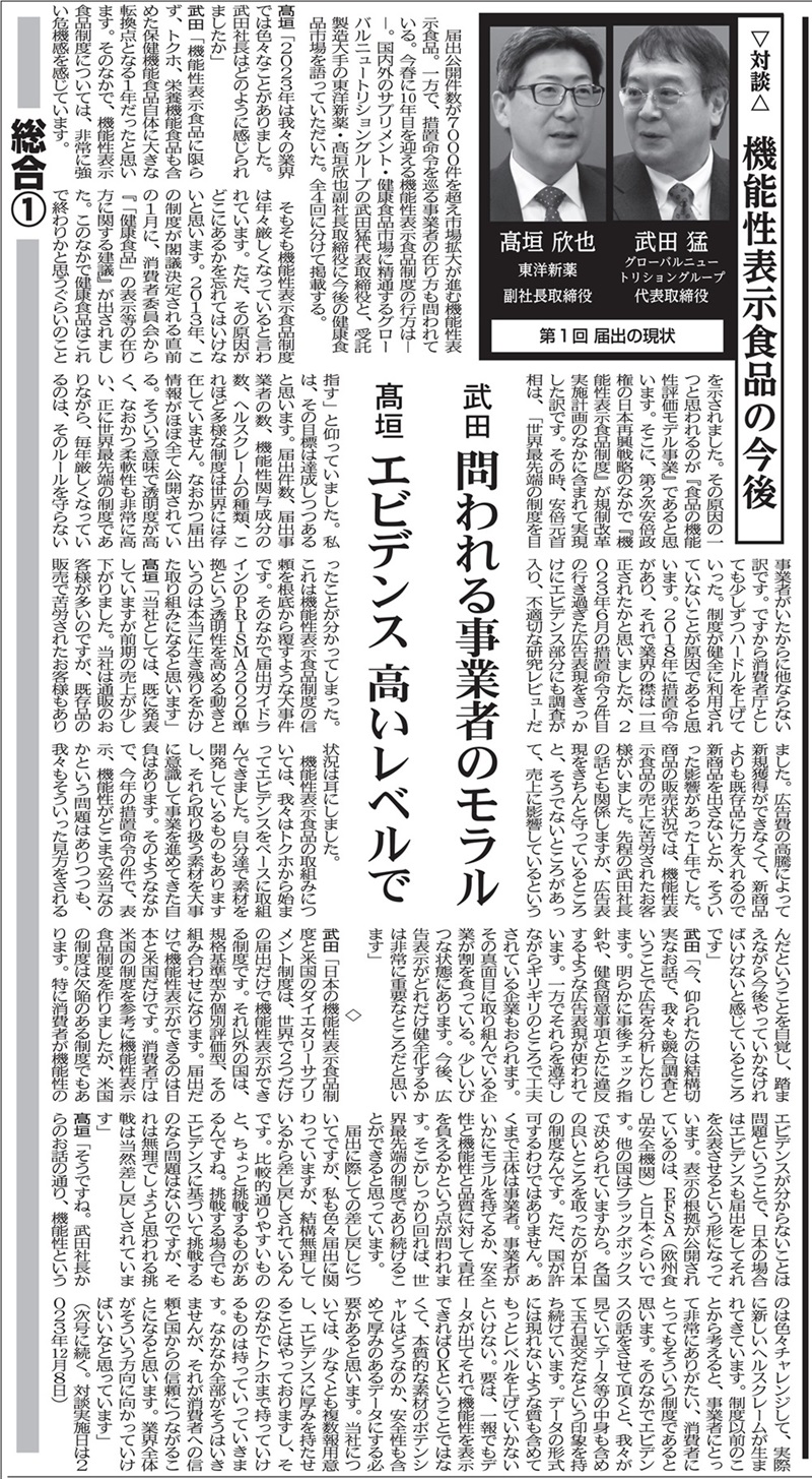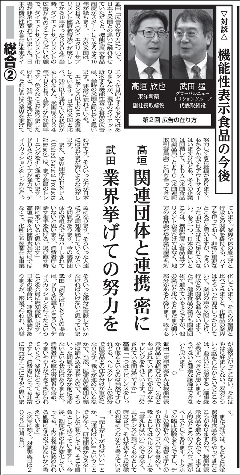 健康産業流通新聞で、株式会社グローバルニュートリショングループ 代表取締役 武田様と弊社 副社長取締役 高垣の対談が掲載されました